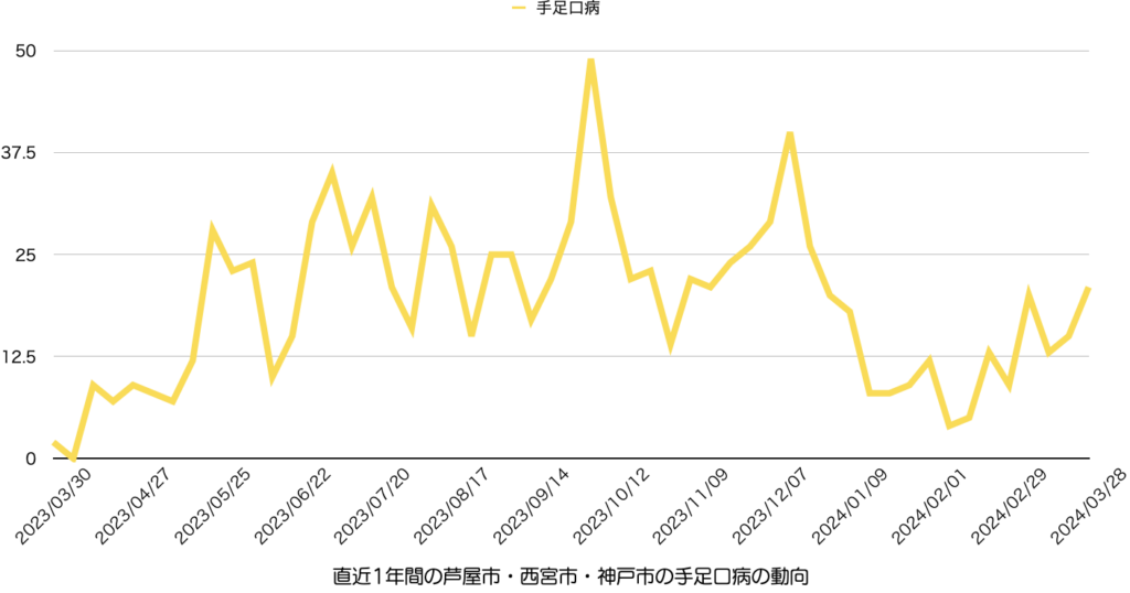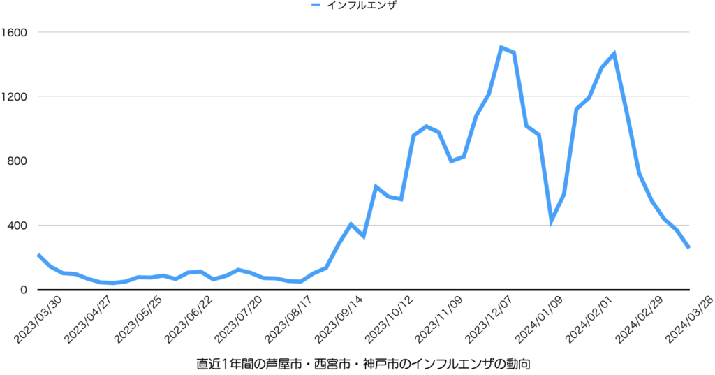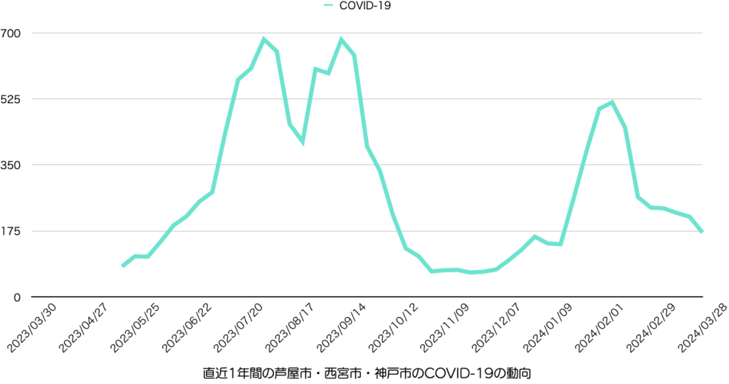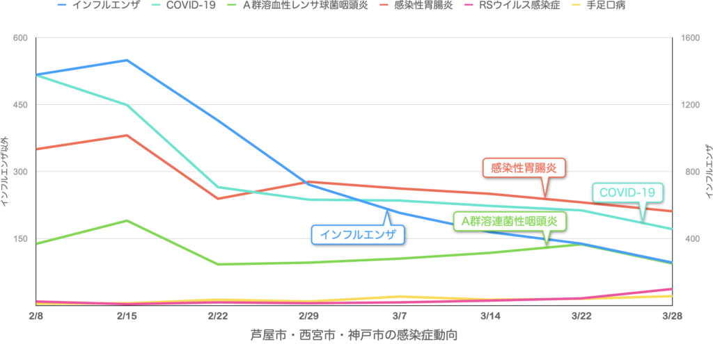 兵庫県感染症情報センターからリリースされている週報から芦屋市・西宮市・神戸市の情報をピックアップして集計したものを若干のコメントをつけて配信しています。