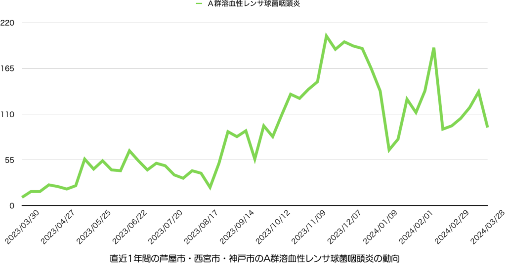 下のグラフは溶連菌性咽頭炎の直近1年間の動向です。