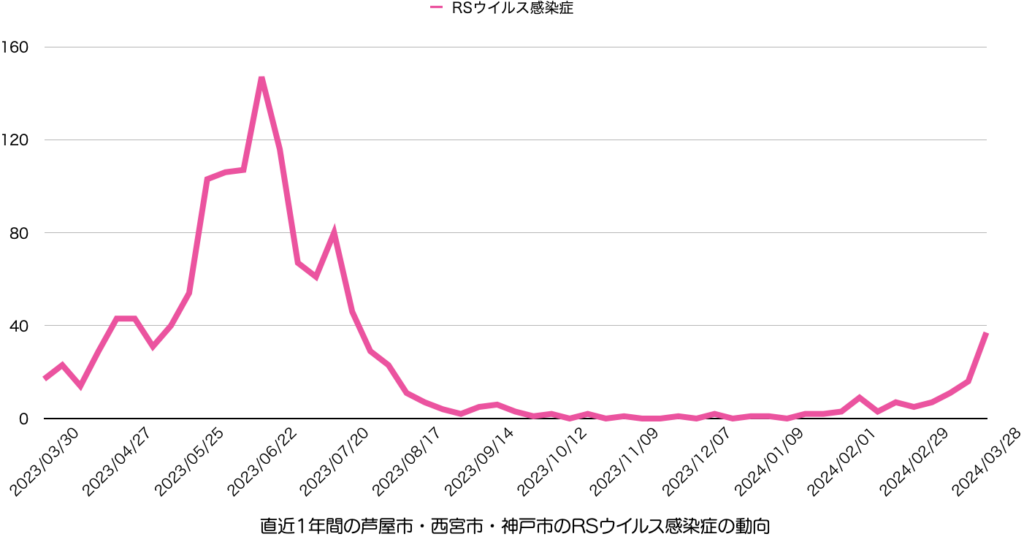 下のグラフはRSウイルス感染症の直近1年間の動向です。