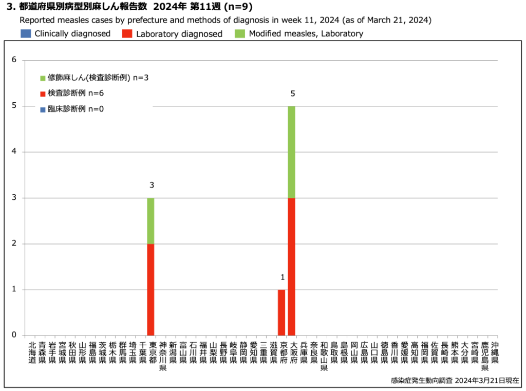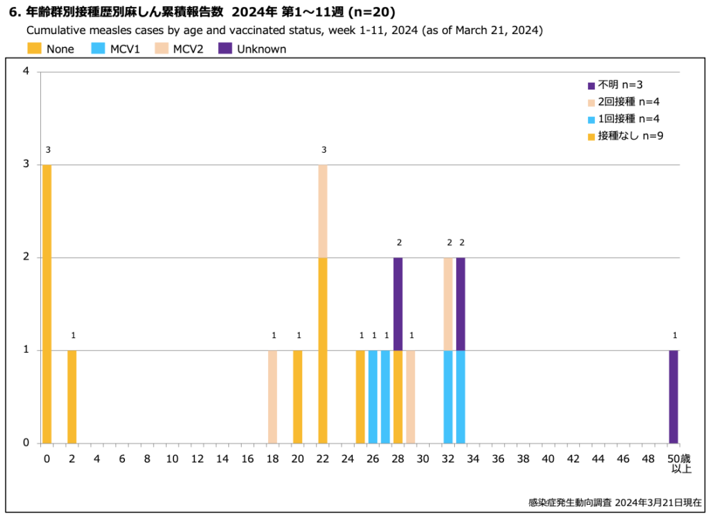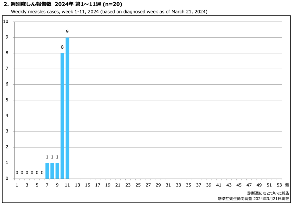 麻疹の報告数は他の感染症より1週遅く現時点の最新データは3/21時点のものです。