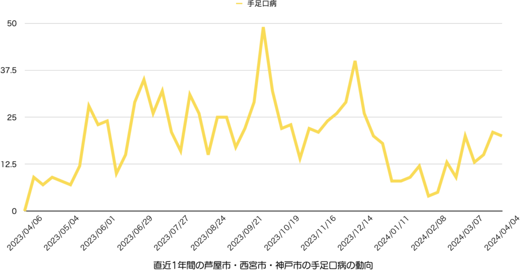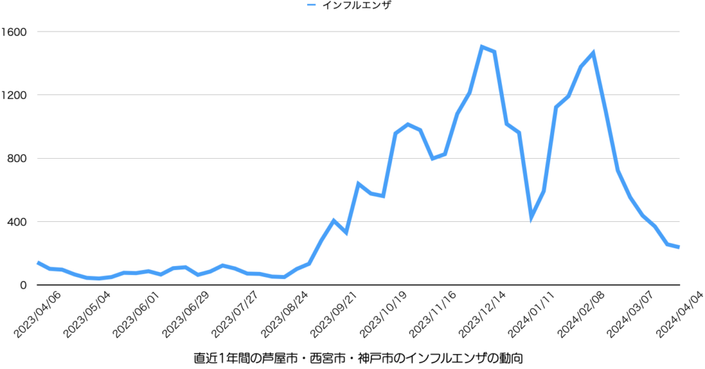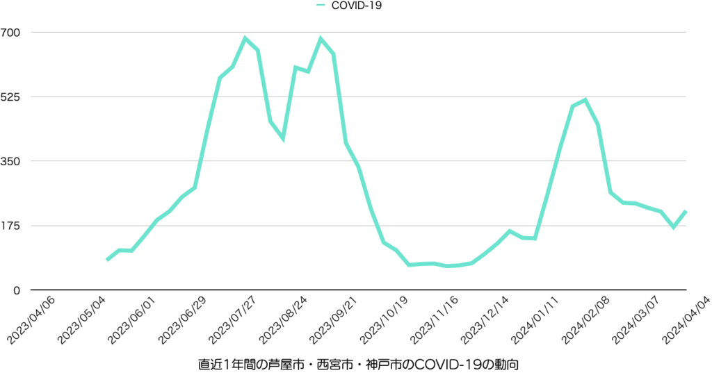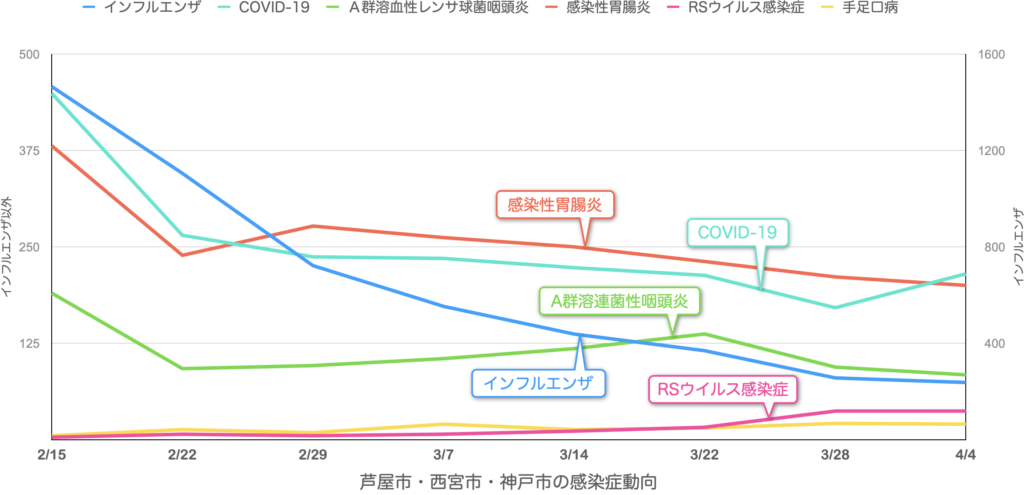 兵庫県感染症情報センターからリリースされている週報から芦屋市・西宮市・神戸市の情報をピックアップして集計したものを若干のコメントをつけて配信しています。