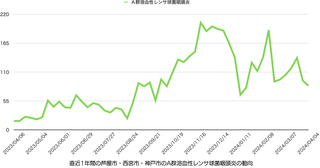 下のグラフは溶連菌性咽頭炎の直近1年間の動向です。