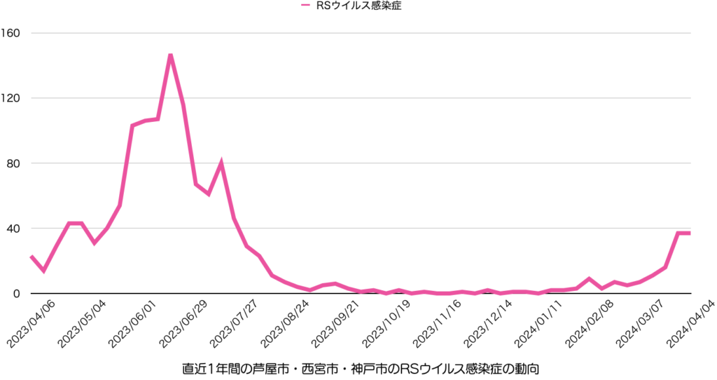 下のグラフはRSウイルス感染症の直近1年間の動向です。