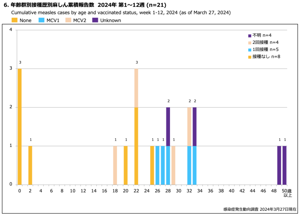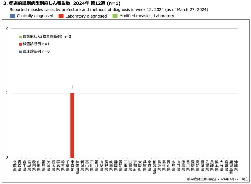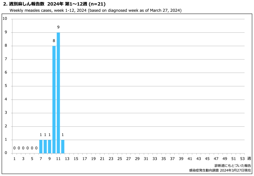 麻疹の報告数は他の感染症より1週ほど遅く現時点の最新データは3/27時点のものです。