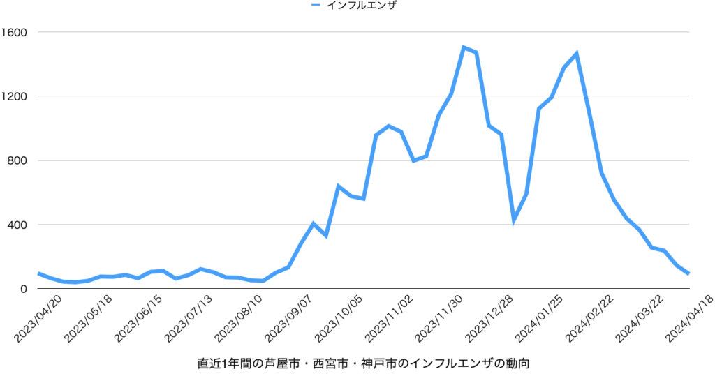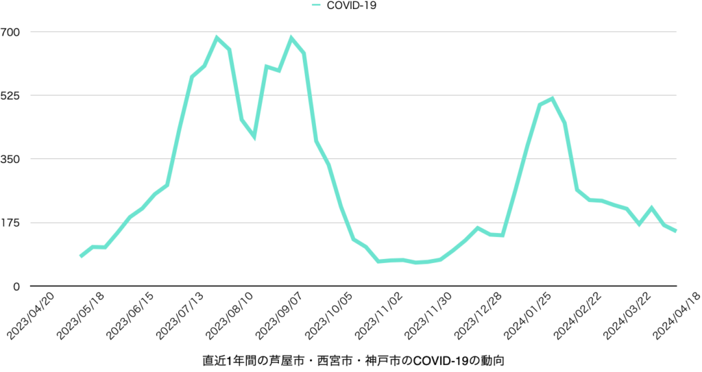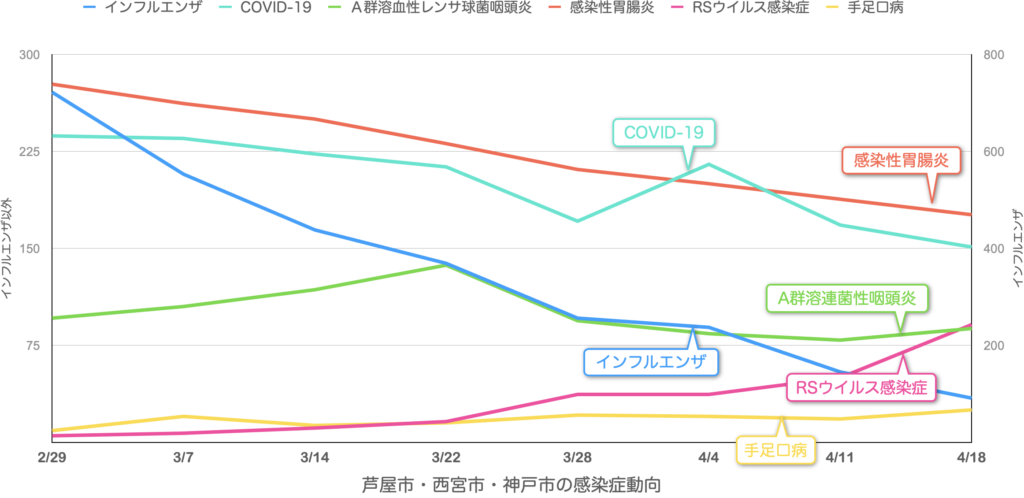 兵庫県感染症情報センターからリリースされている週報から芦屋市・西宮市・神戸市の情報をピックアップして集計したものを若干のコメントをつけて配信しています。