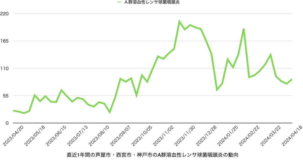 下のグラフは溶連菌性咽頭炎の直近1年間の動向です。