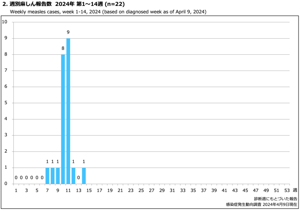 麻疹の報告数は他の感染症より1週ほど遅く現時点のデータは4/9時点のものです。