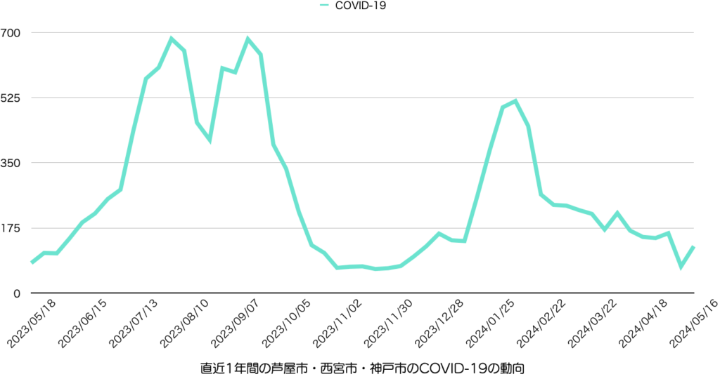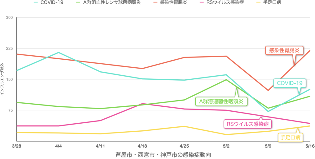 兵庫県感染症情報センターからリリースされている週報から芦屋市・西宮市・神戸市の情報をピックアップして集計したものを若干のコメントをつけて配信しています。