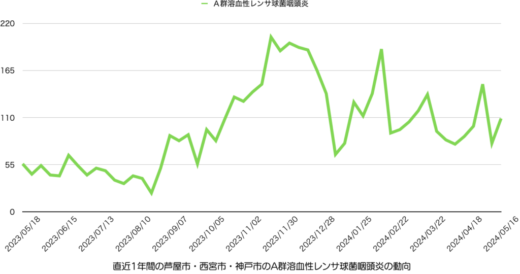 下のグラフは溶連菌性咽頭炎の直近1年間の動向です。