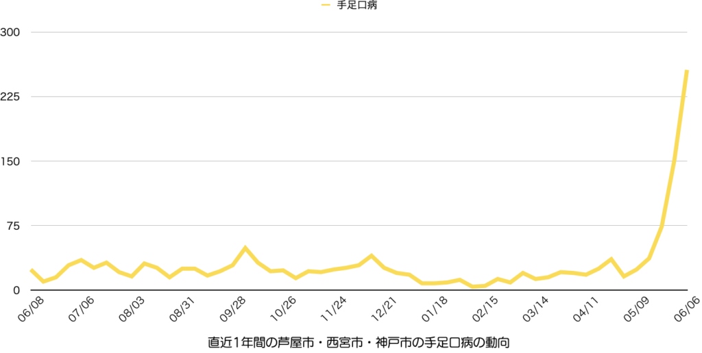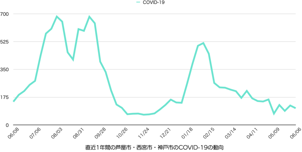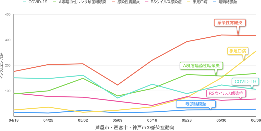 兵庫県感染症情報センターからリリースされている週報から芦屋市・西宮市・神戸市の情報をピックアップして集計したものを若干のコメントをつけて配信しています。