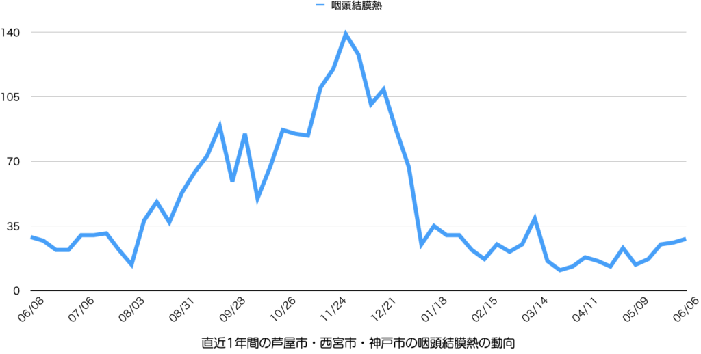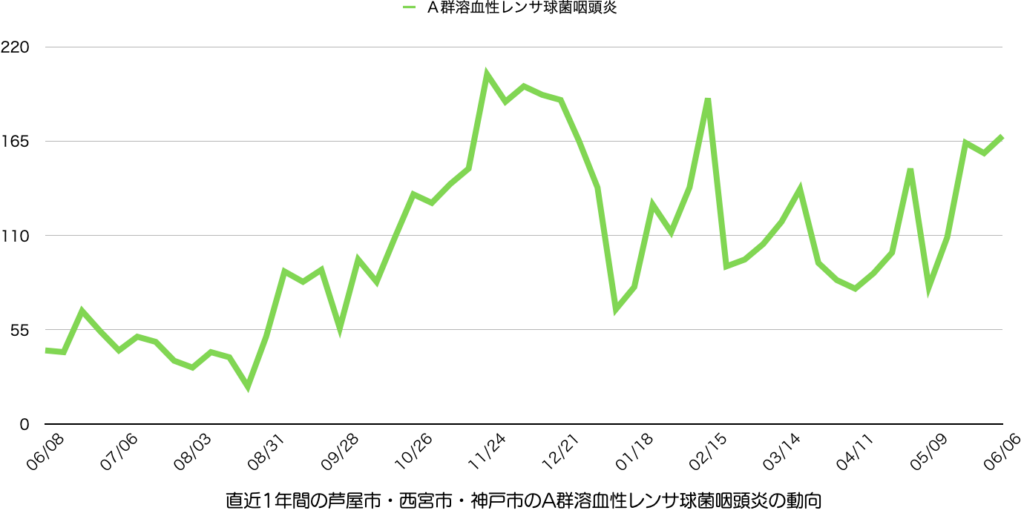 下のグラフは溶連菌性咽頭炎の直近1年間の動向です。