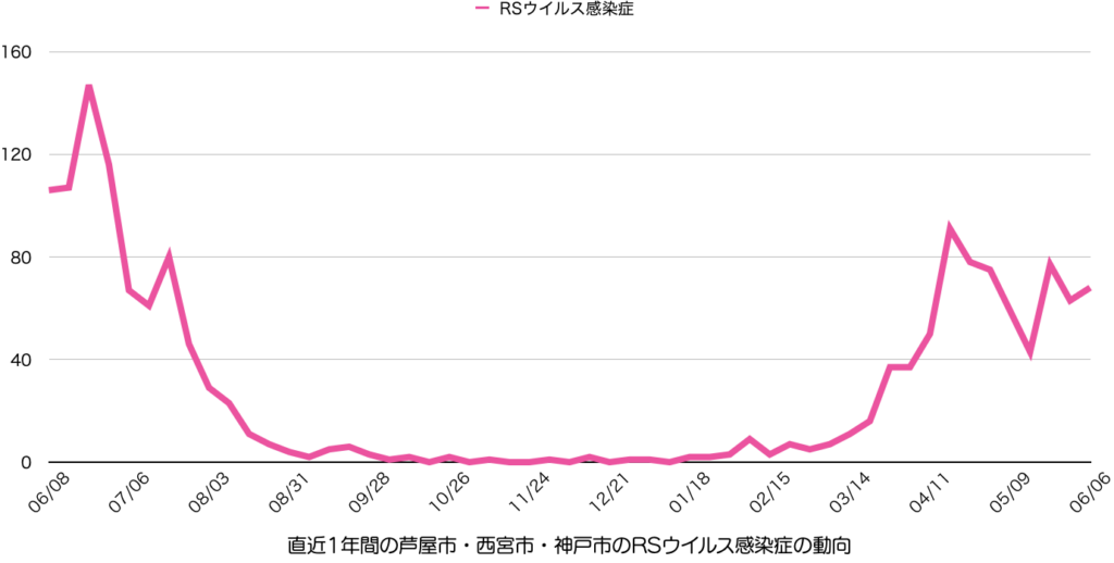 RSウイルス感染症は4/18以降減少し、5月中旬以降はやや減少傾向が鈍っているように思われます。