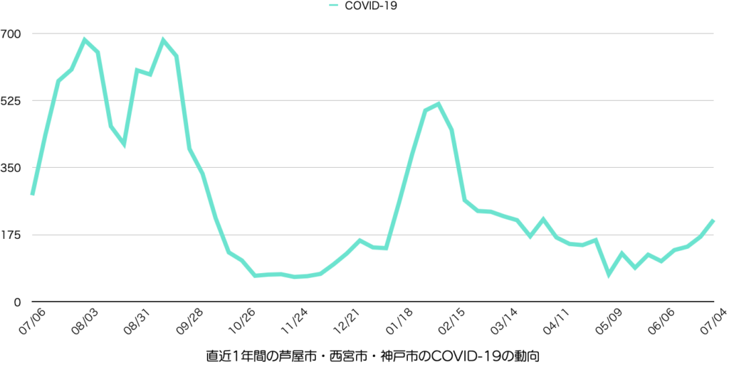 兵庫県感染症情報センターからリリースされている週報から芦屋市・西宮市・神戸市の情報をピックアップして集計したものを若干のコメントをつけて配信しています。