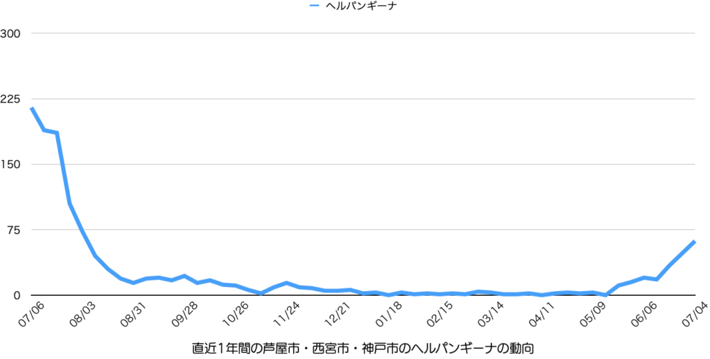今週からヘルパンギーナが掲載になり、RSウイルス・咽頭結膜熱(プール熱)は掲載を終了しました。