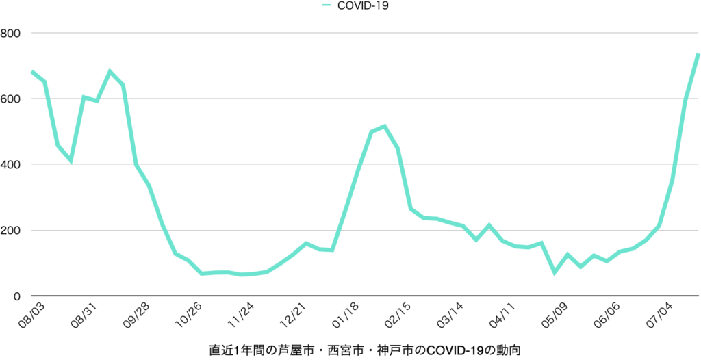 COVID-19は7月初旬から急増フェーズに入った後、一気にこの1年で最多となりました。