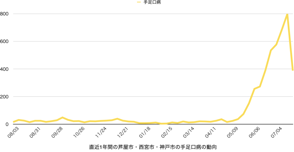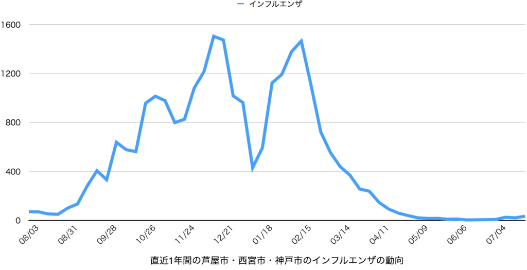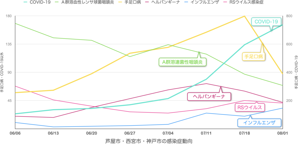 兵庫県感染症情報センターからリリースされている週報から芦屋市・西宮市・神戸市の情報をピックアップして集計したものを若干のコメントをつけて配信しています。