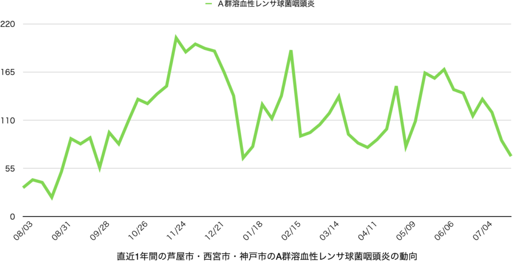 溶連菌性咽頭炎は絶対数は少なくないものの中期的には減少傾向と言えそうです。