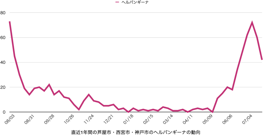 ヘルパンギーナは2週連続で減少しており、収束に向かうことが期待されます。