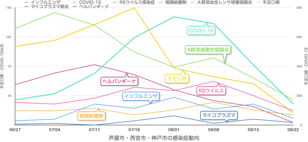 兵庫県感染症情報センターからリリースされている週報から芦屋市・西宮市・神戸市の情報をピックアップして集計したものを若干のコメントをつけて配信しています。