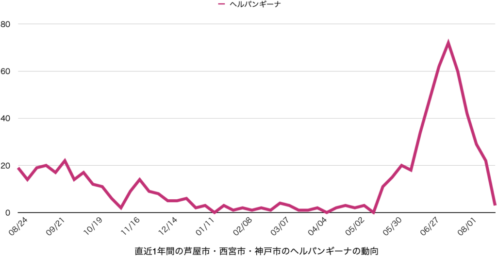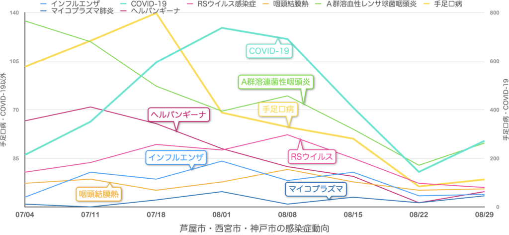 兵庫県感染症情報センターからリリースされている週報から芦屋市・西宮市・神戸市の情報をピックアップして集計したものを若干のコメントをつけて配信しています。