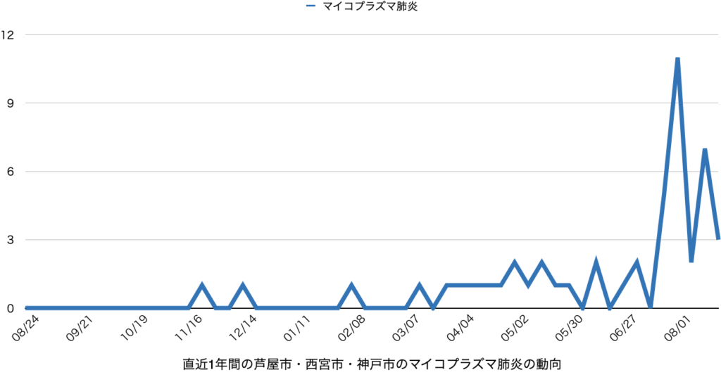 当エリアの絶対数は多くないものの、当クリニックでもマイコプラズマ肺炎を疑い抗菌療法をさせて頂く機会が増えています。