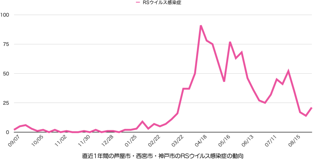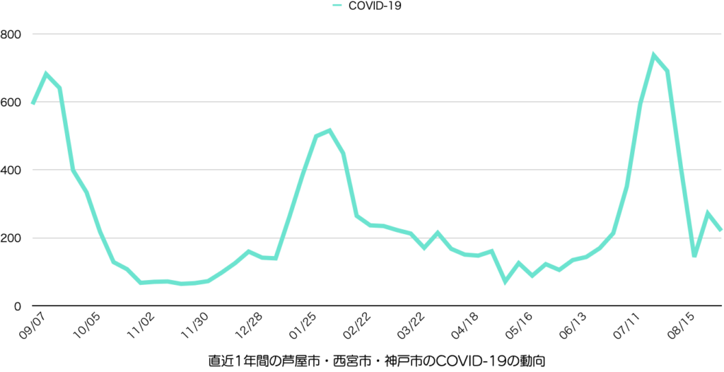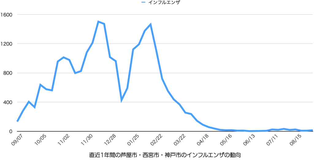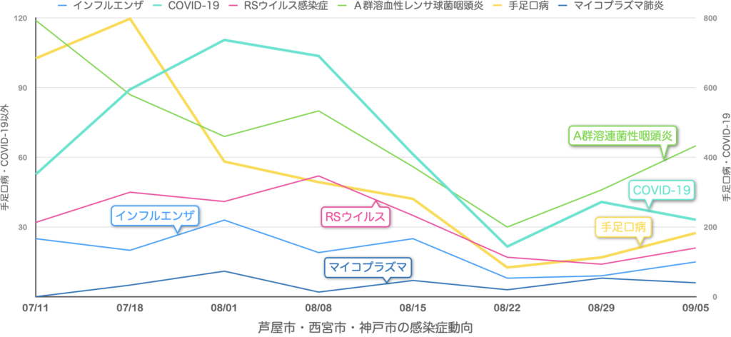 兵庫県感染症情報センターからリリースされている週報から芦屋市・西宮市・神戸市の情報をピックアップして集計したものを若干のコメントをつけて配信しています。