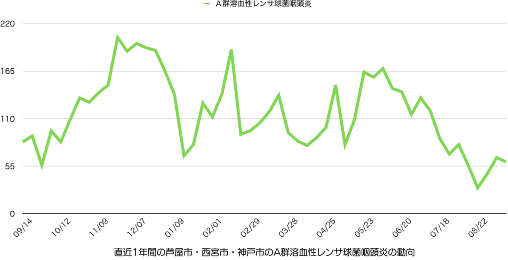 少ない絶対数ではありますが、通常の非流行期に比べると高いレベルで推移中です。