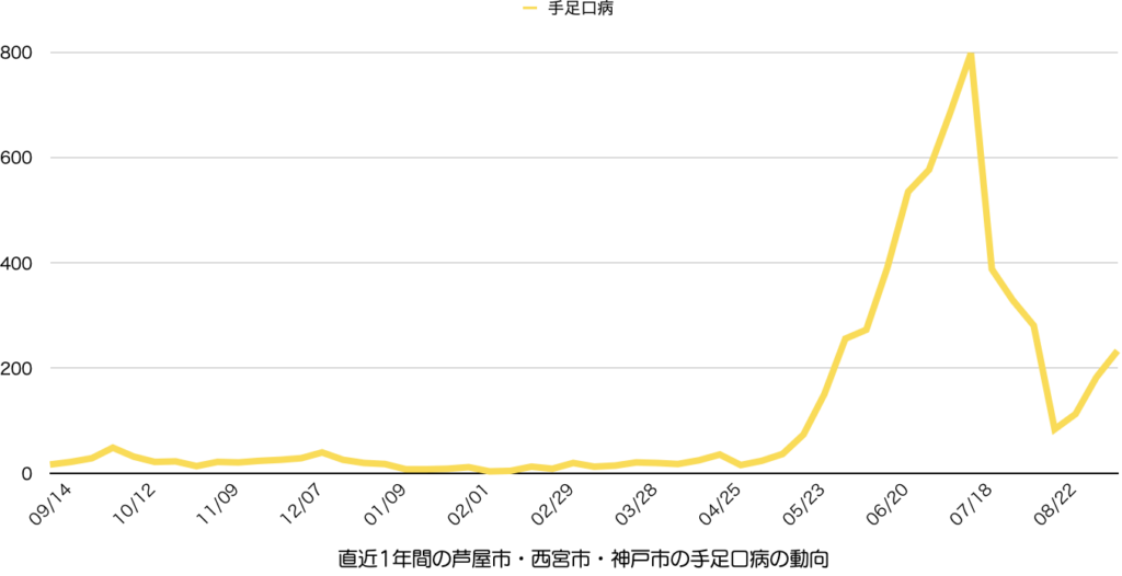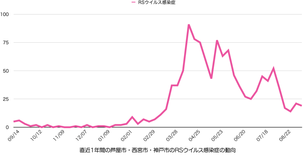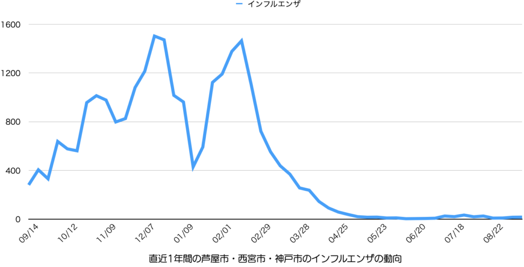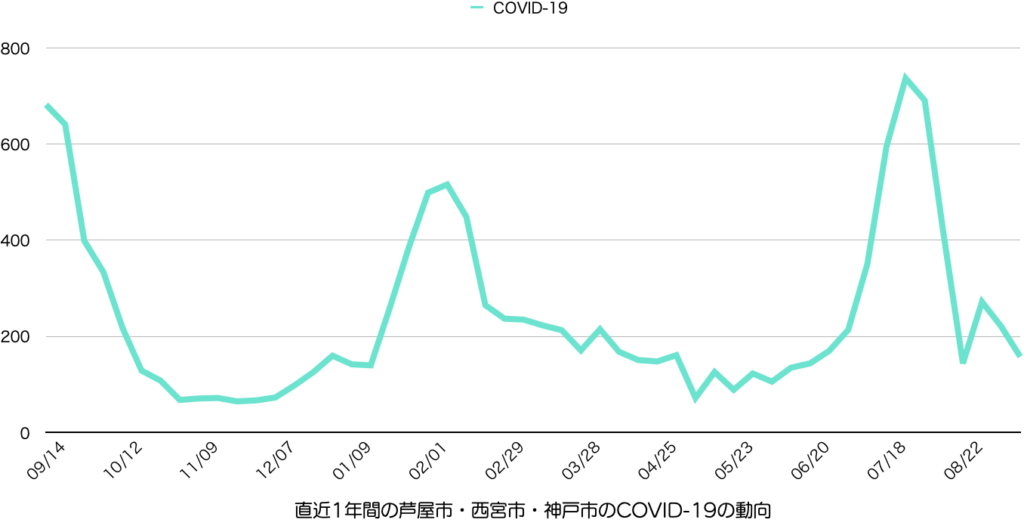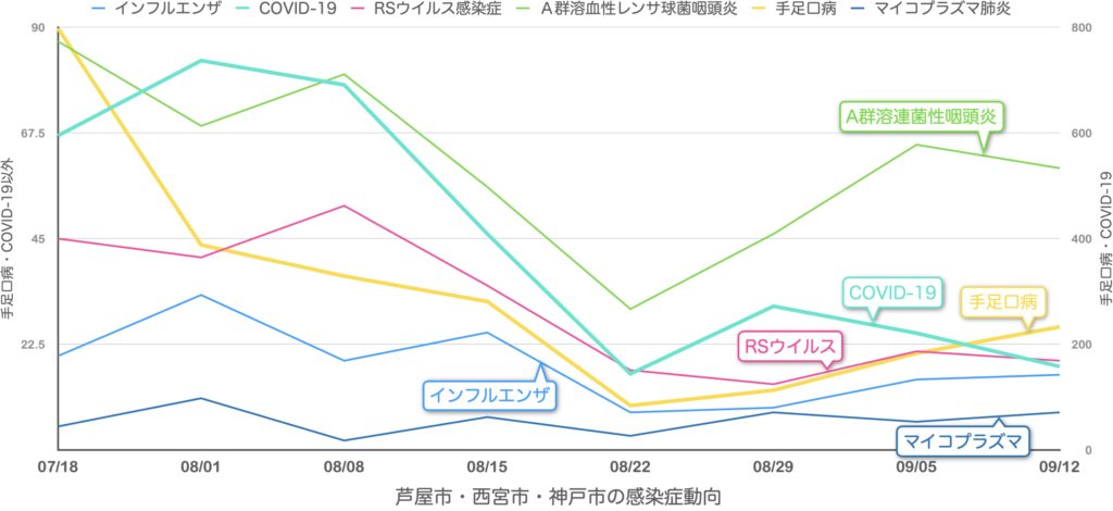 兵庫県感染症情報センターからリリースされている週報から芦屋市・西宮市・神戸市の情報をピックアップして集計したものを若干のコメントをつけて配信しています。