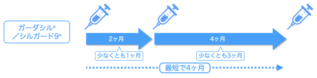 - 標準的に接種できない場合は、2回目は1回目から1ヶ月以上空け、3回目は2回目から3ヶ月空ければ接種可能です。