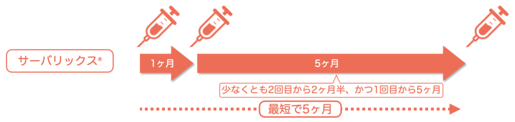 - 標準的には、2回目は1回目から1ヶ月以上空け、3回目は2回目から5ヶ月空けて接種します。