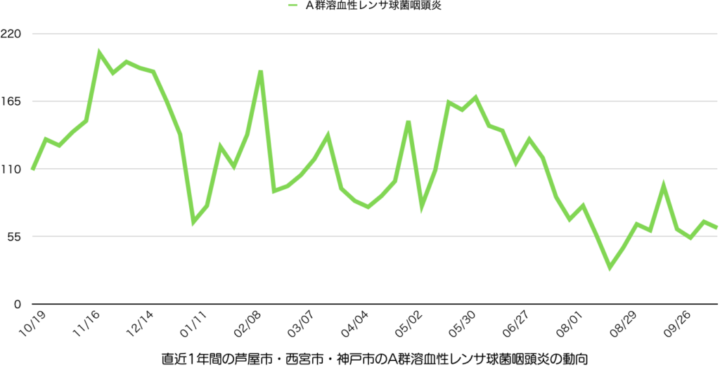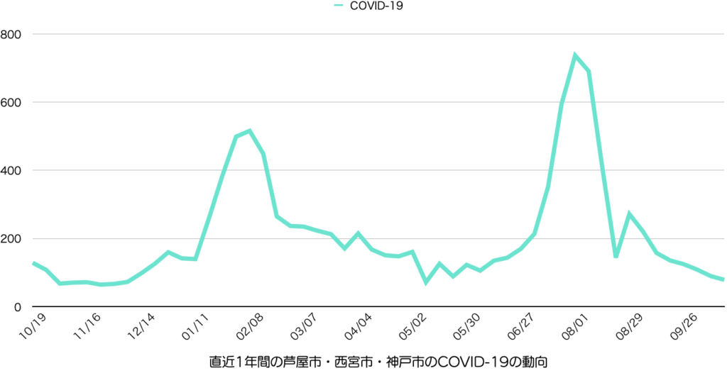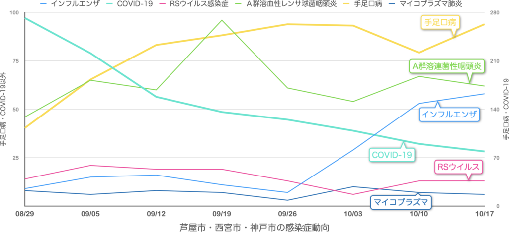 兵庫県感染症情報センターからリリースされている週報から芦屋市・西宮市・神戸市の情報をピックアップして集計したものを若干のコメントをつけて配信しています。