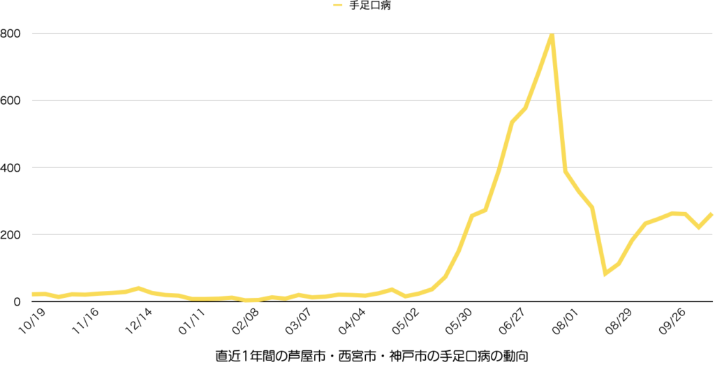 手足口病は4週間前から発表される感染症データの中で最多報告数となりました。