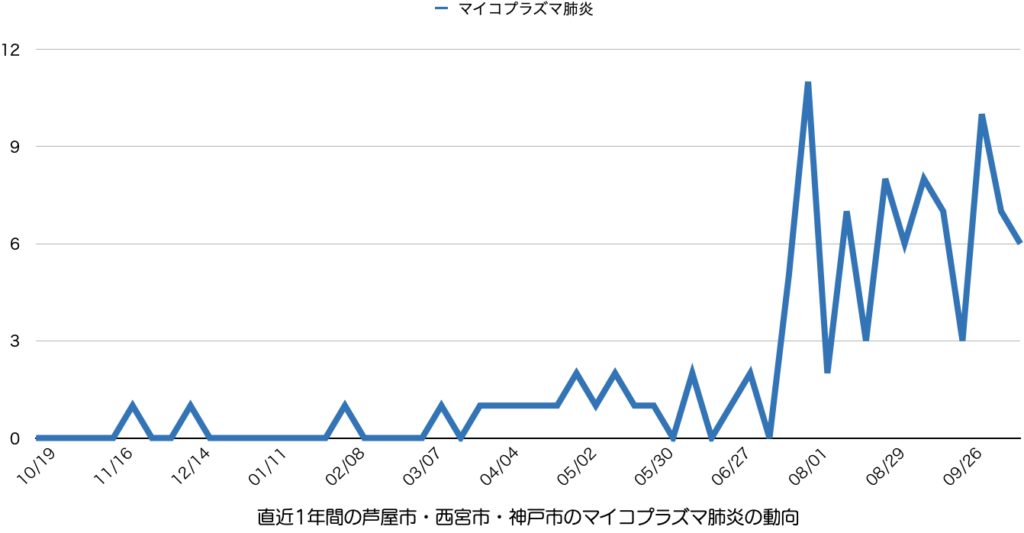 例えば兵庫県内でも姫路市は12.00、加古川市が13.00と非常に高い数値を示す一方、西宮市や尼崎市は0といった具合です(芦屋市にはマイコプラズマ肺炎の定点報告医療機関がありません)。