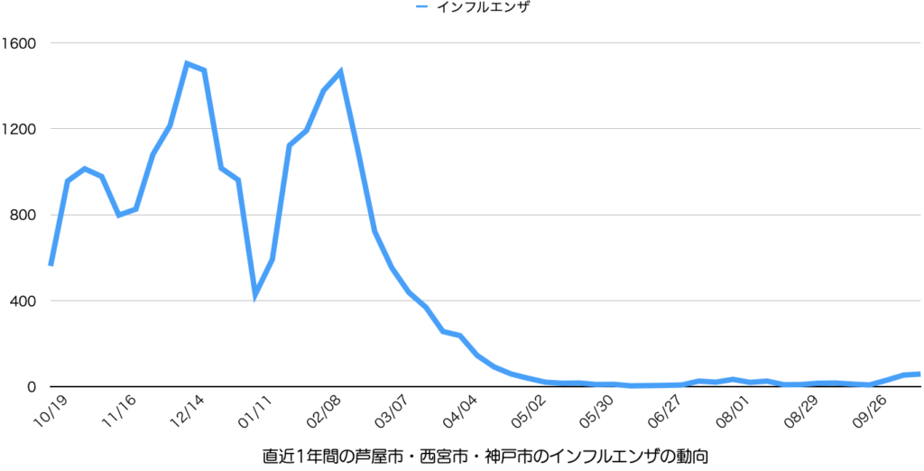 芦屋市内ではインフルエンザに関連していると思われる学級閉鎖も行われるようになっており、引き続き今後の動向に留意が必要です。