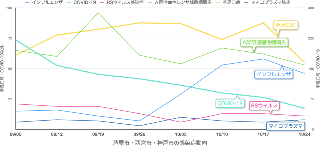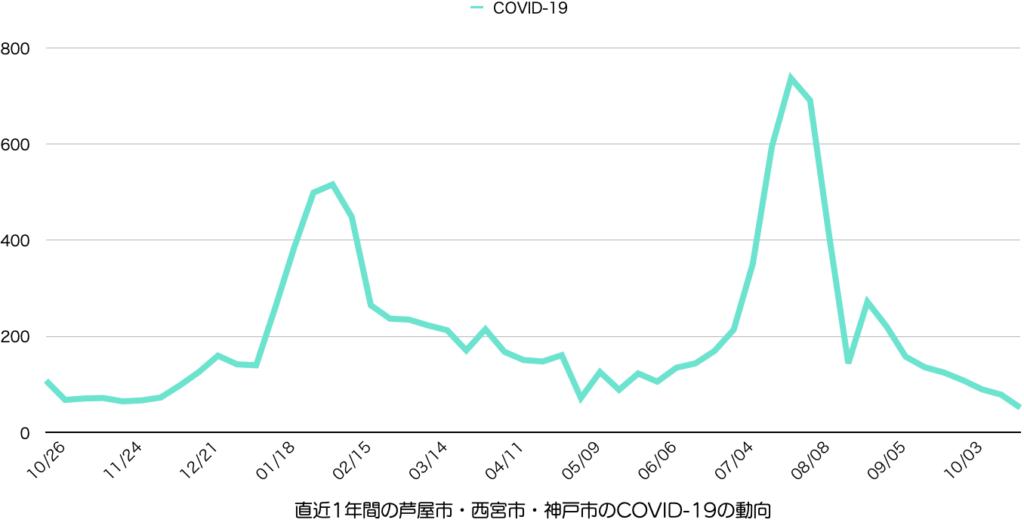 兵庫県感染症情報センターからリリースされている週報から芦屋市・西宮市・神戸市の情報をピックアップして集計したものを若干のコメントをつけて配信しています。