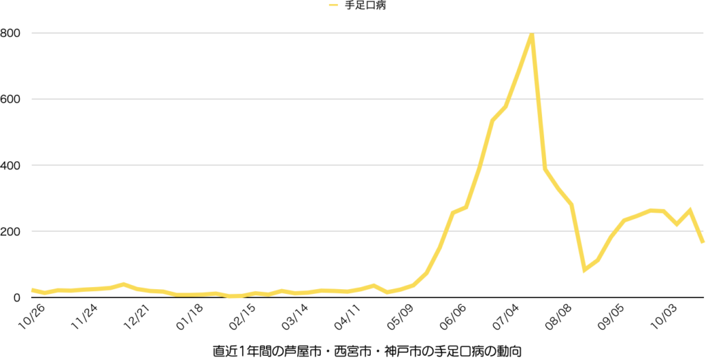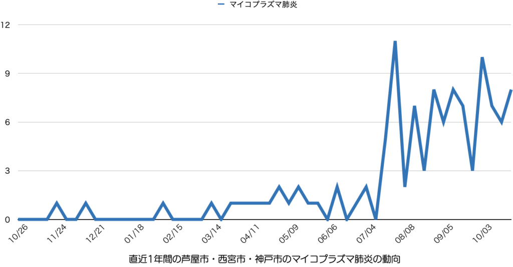 例えば兵庫県内でも加古川市が9.00、姫路市が6.00と高い数値を示す一方、神戸市は1.67、尼崎市は2.0といった具合です(芦屋市にはマイコプラズマ肺炎の定点報告医療機関がありません)。