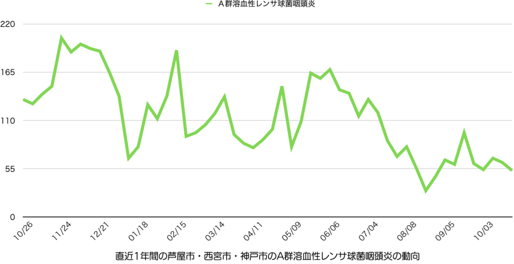 溶連菌性咽頭炎は中期的には減少傾向として良さそうですが、絶対数が多い状況で推移しています。