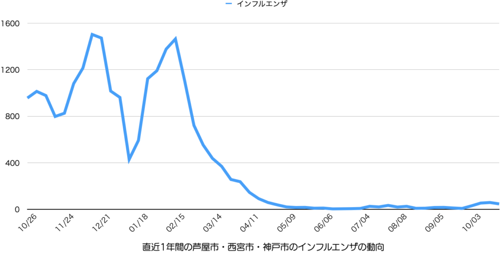 芦屋市内ではインフルエンザに関連していると思われる学級閉鎖も行われるようになっており、引き続き今後の動向に留意が必要です。