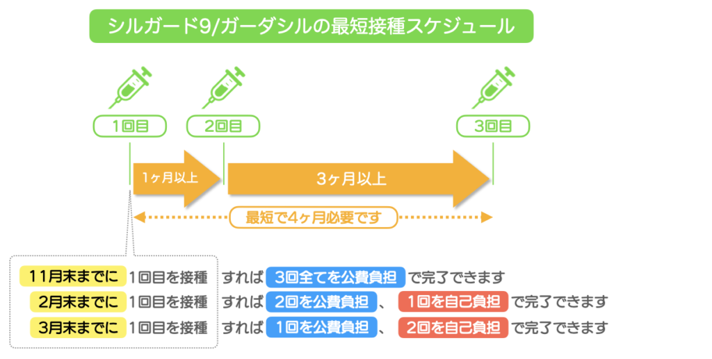 1回目の接種を11月末までにすれば3回全てを、2月末までなら2回を、3月末までなら1回を公費負担で接種可能です。残りの接種は自己負担となります。