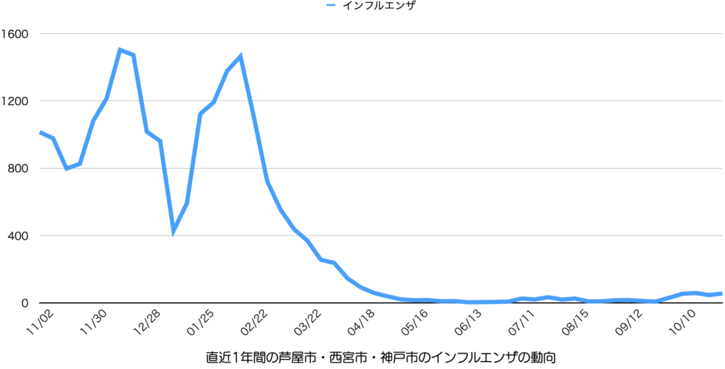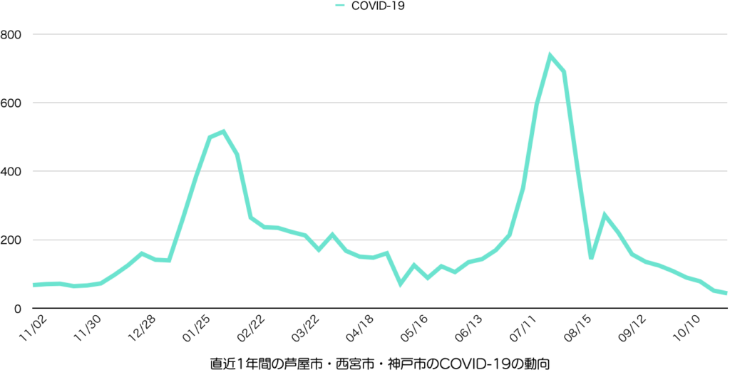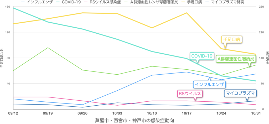 兵庫県感染症情報センターからリリースされている週報から芦屋市・西宮市・神戸市の情報をピックアップして集計したものを若干のコメントをつけて配信しています。