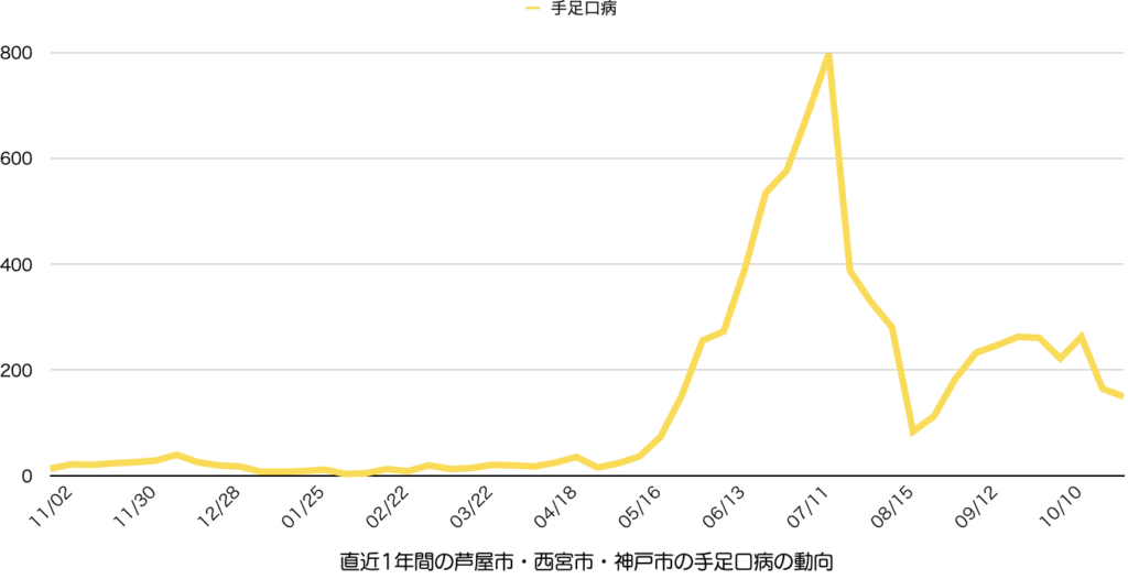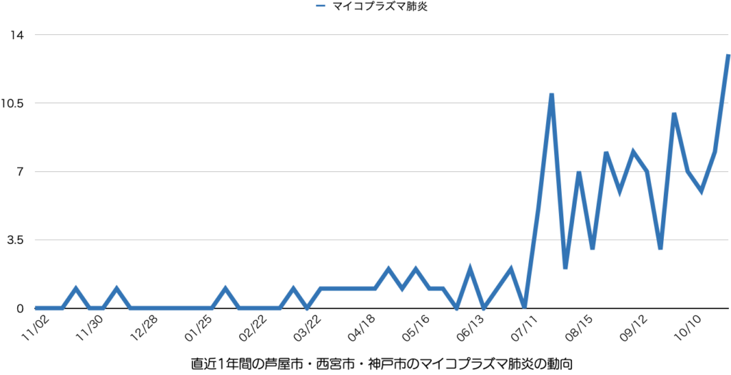 例えば兵庫県内でも加古川市が18.00、姫路市が7.00、神戸市が4.00と高い数値を示す一方、尼崎市は2.0、西宮市は1.00といった具合です(芦屋市にはマイコプラズマ肺炎の定点報告医療機関がありません)。