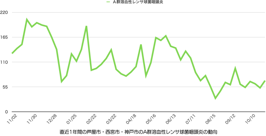 溶連菌性咽頭炎は中期的には減少傾向として良さそうですが、最近1ヶ月ほどは下げ止まりの様相で推移しています。