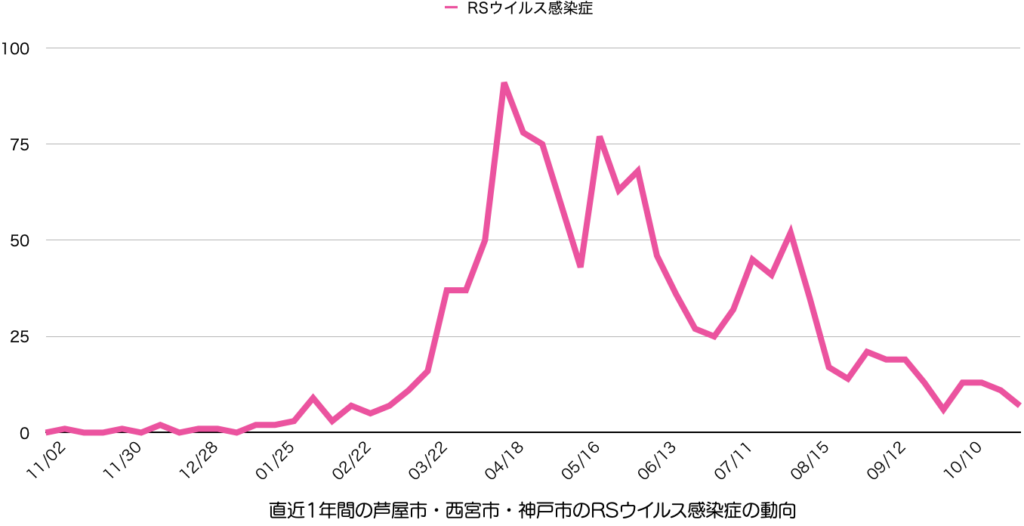 RSウイルス感染症も短期的な増減を繰り返しつつ、減少傾向を維持している様相です。