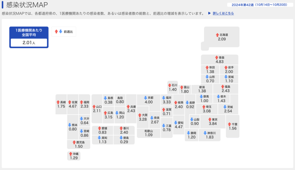 兵庫県の最新状況はというと、定点報告数は2.43で全国で12番目に多い報告数で、隣接する5府県の中で3番目に多い報告数です。