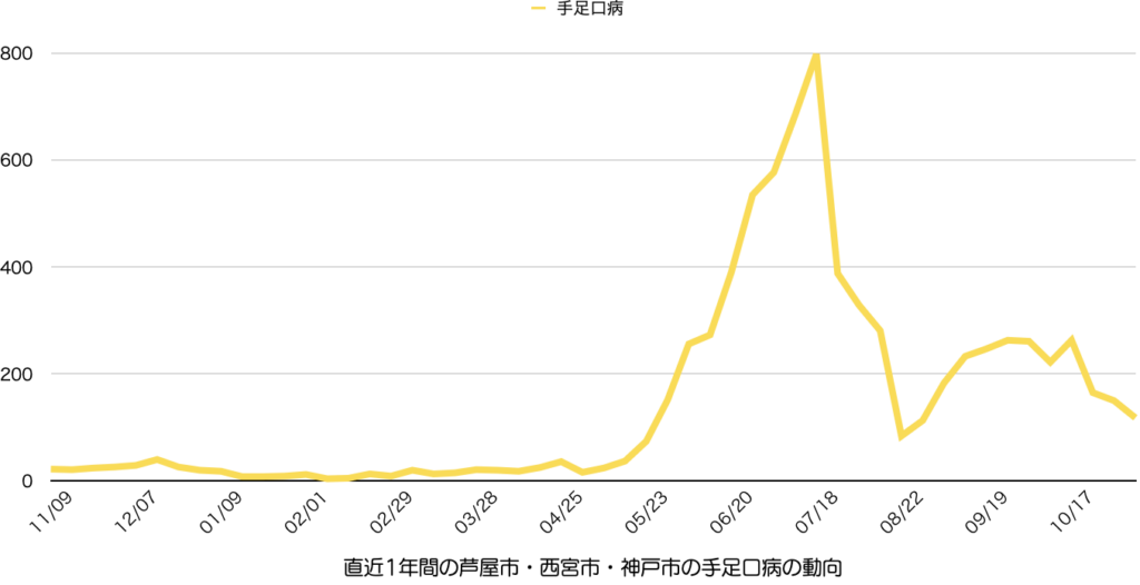 手足口病は6週間前から発表される感染症データの中で最多報告数となった後、10月下旬から低下傾向になっています。