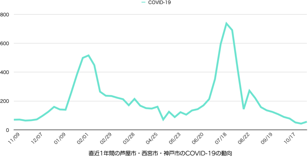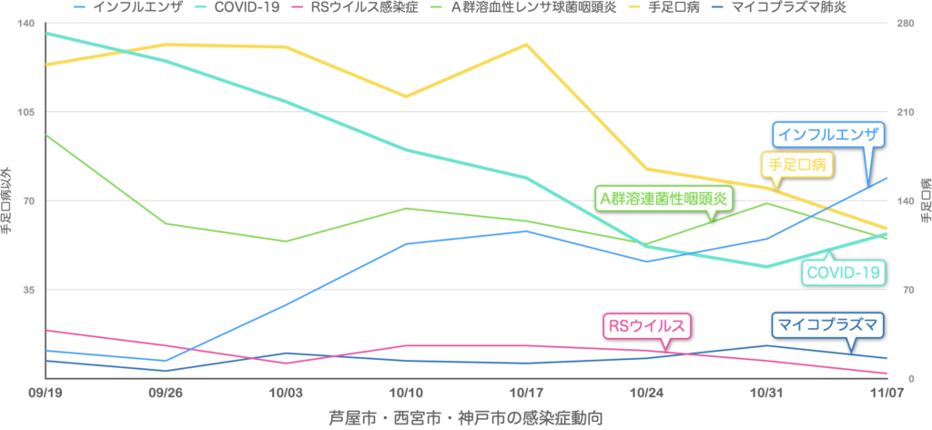 兵庫県感染症情報センターからリリースされている週報から芦屋市・西宮市・神戸市の情報をピックアップして集計したものを若干のコメントをつけて配信しています。
