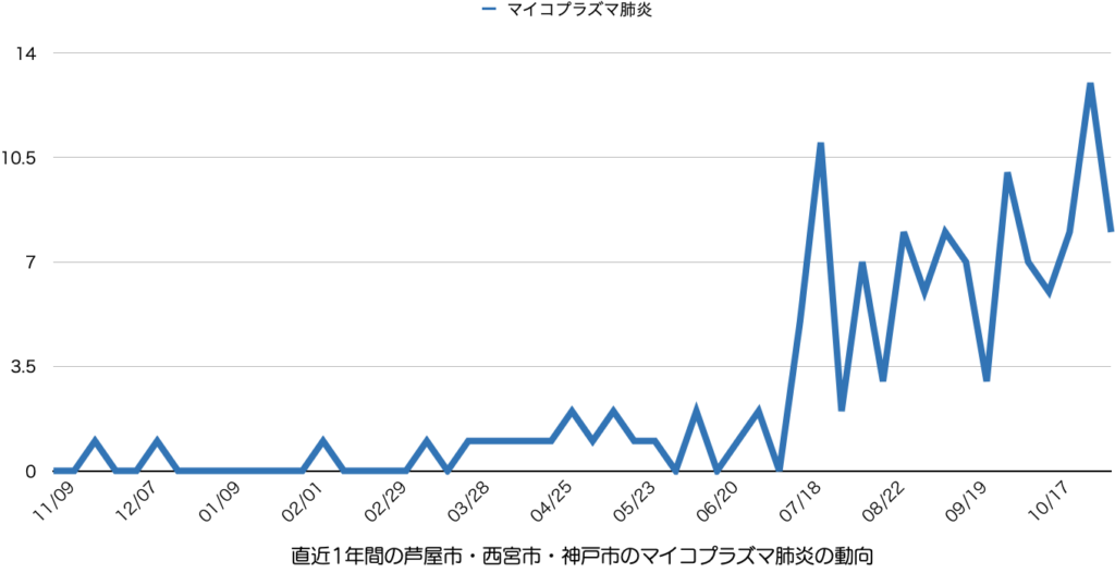 例えば兵庫県内でも加古川市が15.00、姫路市が8.00と高水準を示す一方、神戸市は2.33、尼崎市は2.00、西宮市は1.00といった具合です(芦屋市にはマイコプラズマ肺炎の定点報告医療機関がありません)。