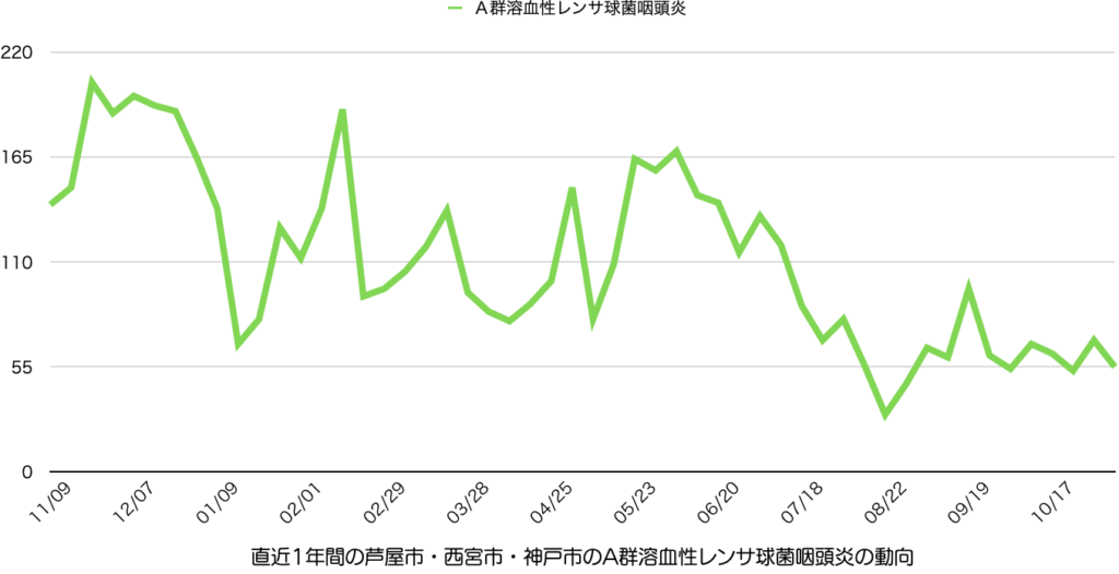 溶連菌性咽頭炎は中期的には減少傾向として良さそうですが、9月末から下げ止まりの様相で推移しています。