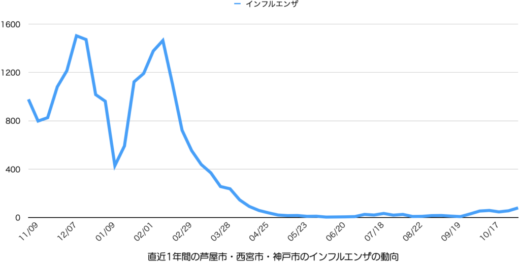 インフルエンザは9月末頃から緩徐な上昇傾向を呈し、今週の兵庫県全体での定点当たり報告数は1.01と1を超えて「流行期」の定義に該当するようになりました。