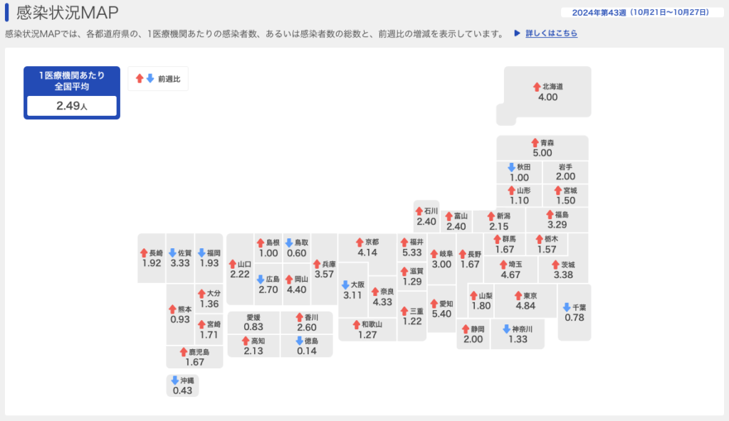 つまりこの場合、東京都の一医療機関が一週間でマイコプラズマ肺炎と診断する患者数が2.80人ということになります(最新データでは4.84人になりました)。